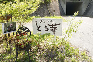 「ギャラリー とう華」店舗の横の小道に入っていくと、玄関があります。